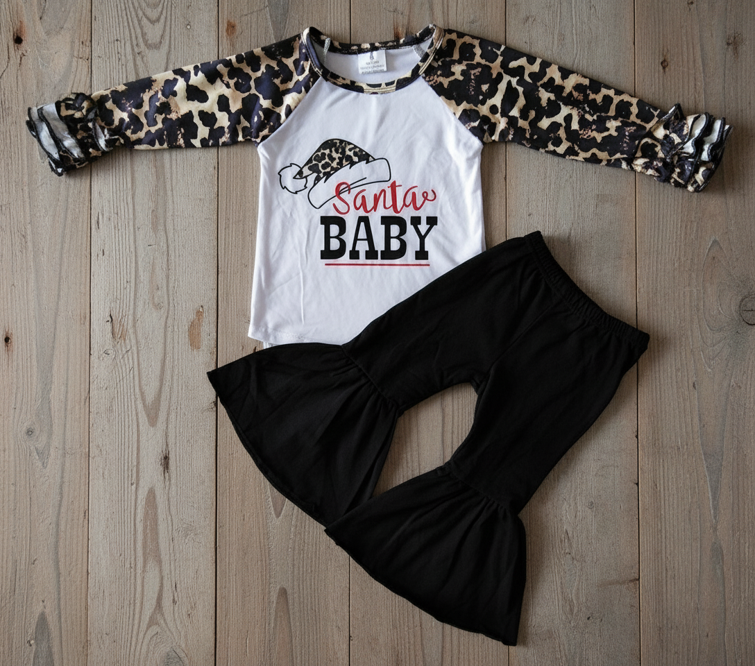 Introducing Santa Baby, the perfect holiday outfit for your little girl! This adorable set features a ruffle pants design and cheetah print accents on the sleeves. With its festive colors and trendy details, your child will look stylish and festive all season long.